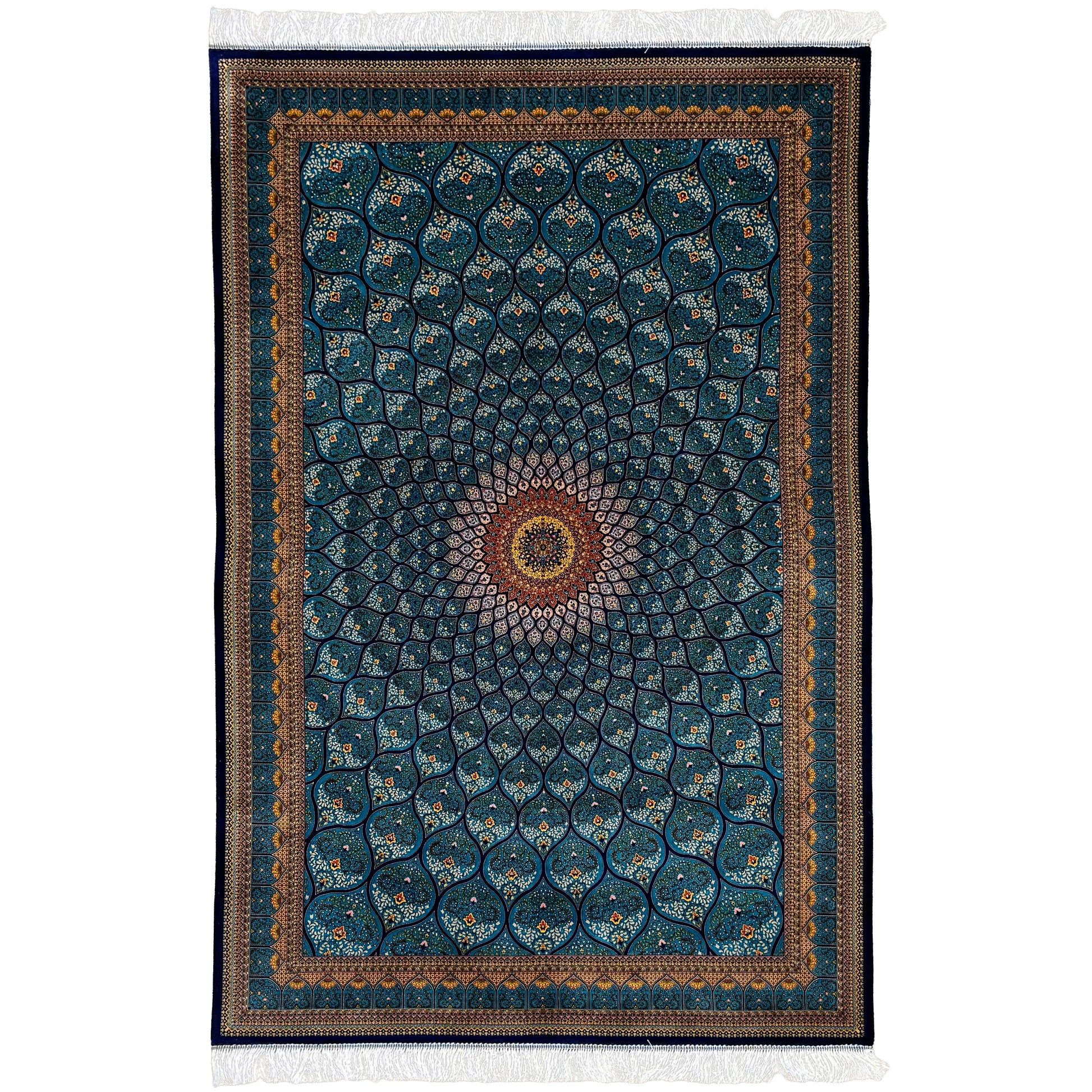 This silk rug features a mesmerizing radial design that mimics the facets of a cut gemstone or the plumage of a peacock. The primary sapphire blue and teal tones radiate from a central eye, creating a tunnel-like depth. Secondary accents of midnight blue and copper highlight the concentric layers of the pattern. The border is kept minimal to allow the expansive radial motif to dominate, finished with white fringe edges.
