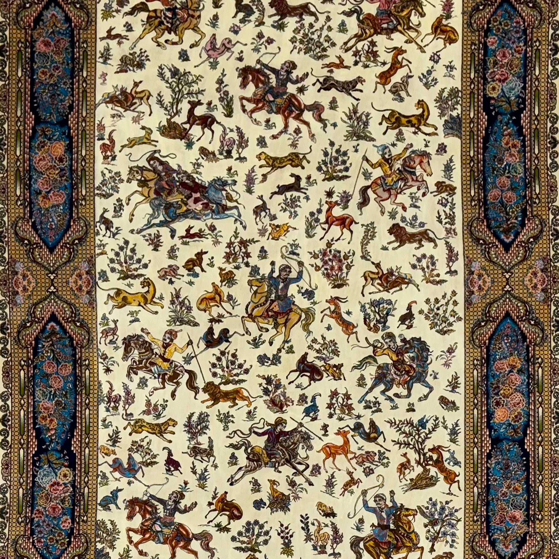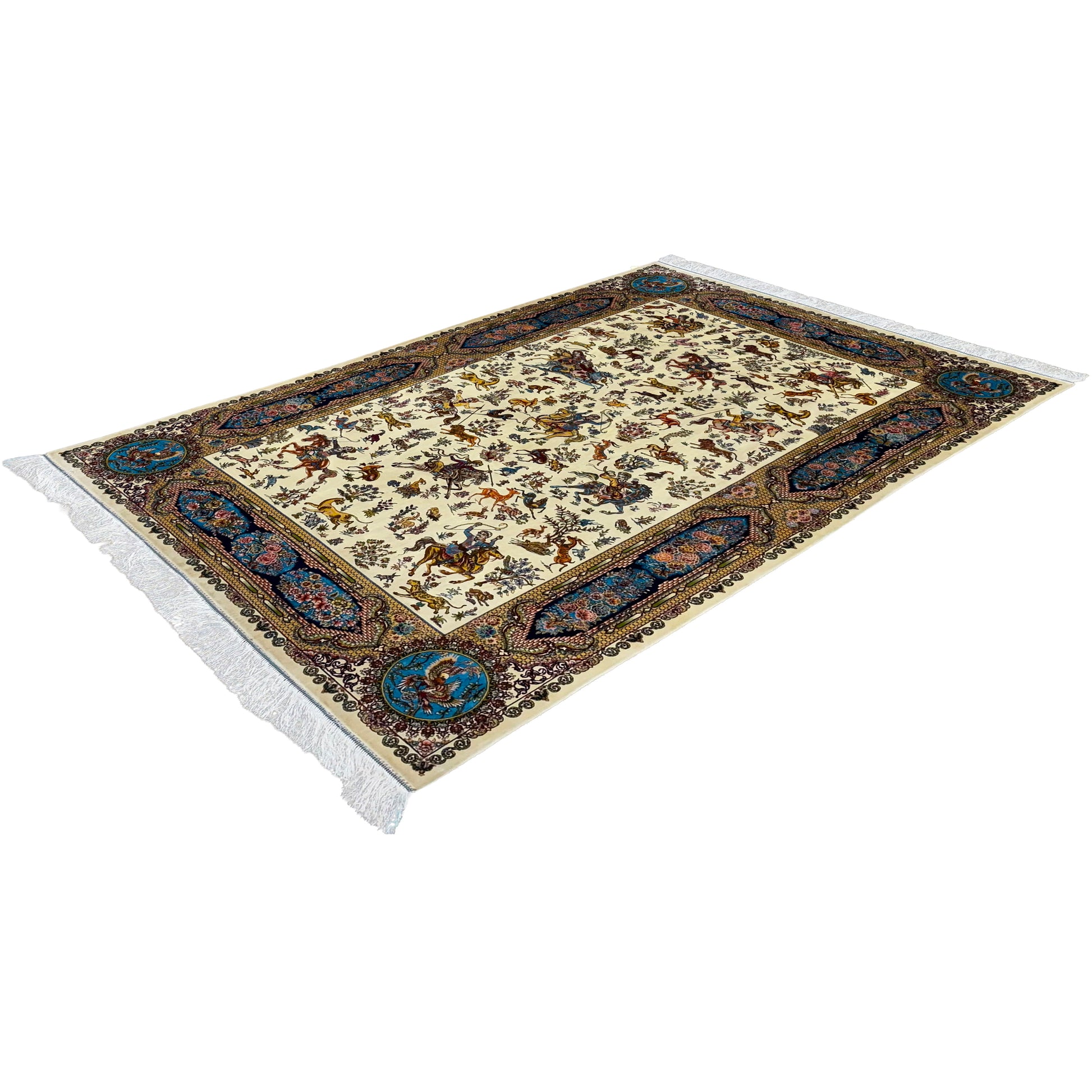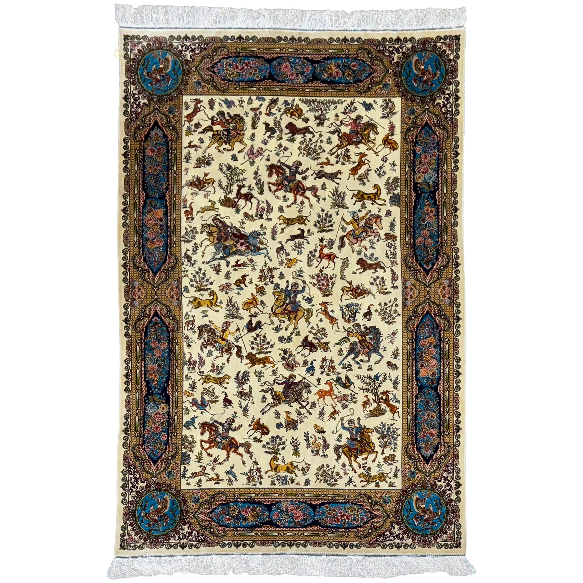 This silk rug features an all-over design of scattered animal and bird motifs, creating a "Royal Menagerie" theme without a central medallion. The primary cream and gold base allows the colorful figures rendered in blues, reds, and greensÑto stand out clearly. The composition feels open and organic, surrounded by a dark, contrasting border filled with scrolling vines. White fringe edges add a refined touch to this storytelling rug.