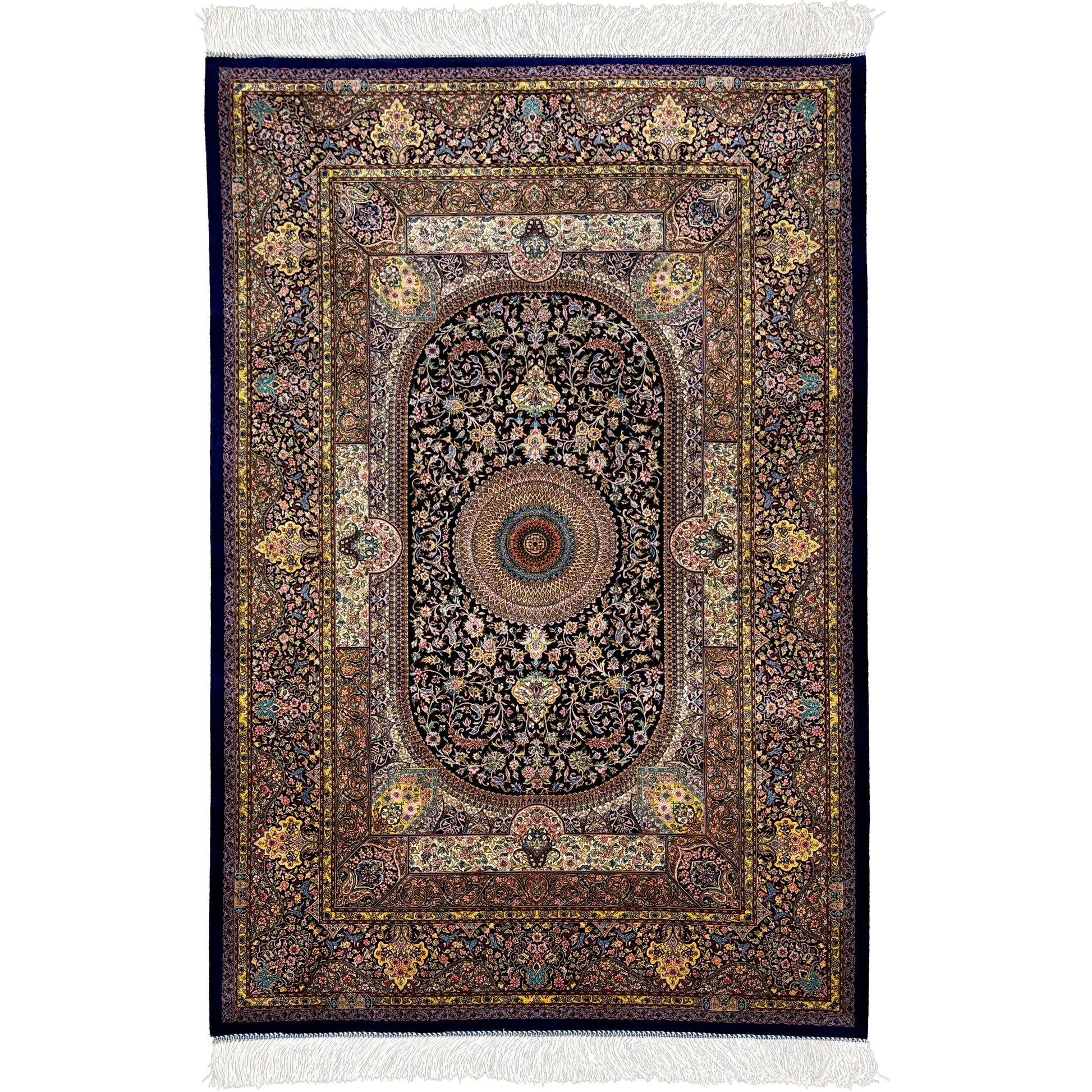 This silk rug features a sharp, high-contrast medallion design on a field of charcoal and deep black. The central motif stands out in bright ivory and soft beige, creating a prism-like effect against the dark background. The border is heavily detailed with floral geometry, softening the boldness of the central contrast. White fringe edges provide a dramatic final touch to this monochromatic masterpiece.