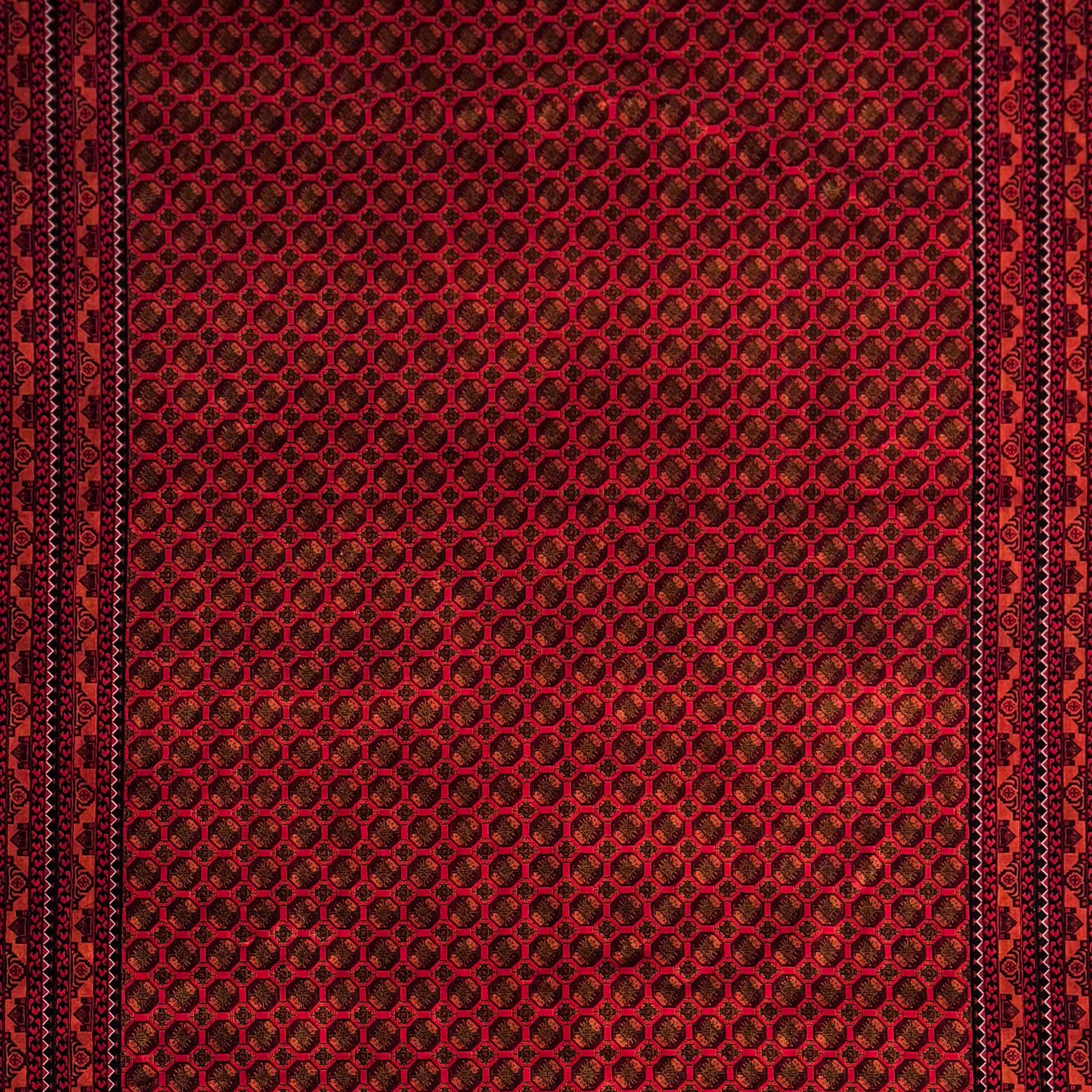This silk rug features a red base with intricate geometric and floral patterns woven throughout. Black detailing adds depth, creating strong contrasts within the design. Structured borders frame the piece, while fringed edges provide a classic finish.