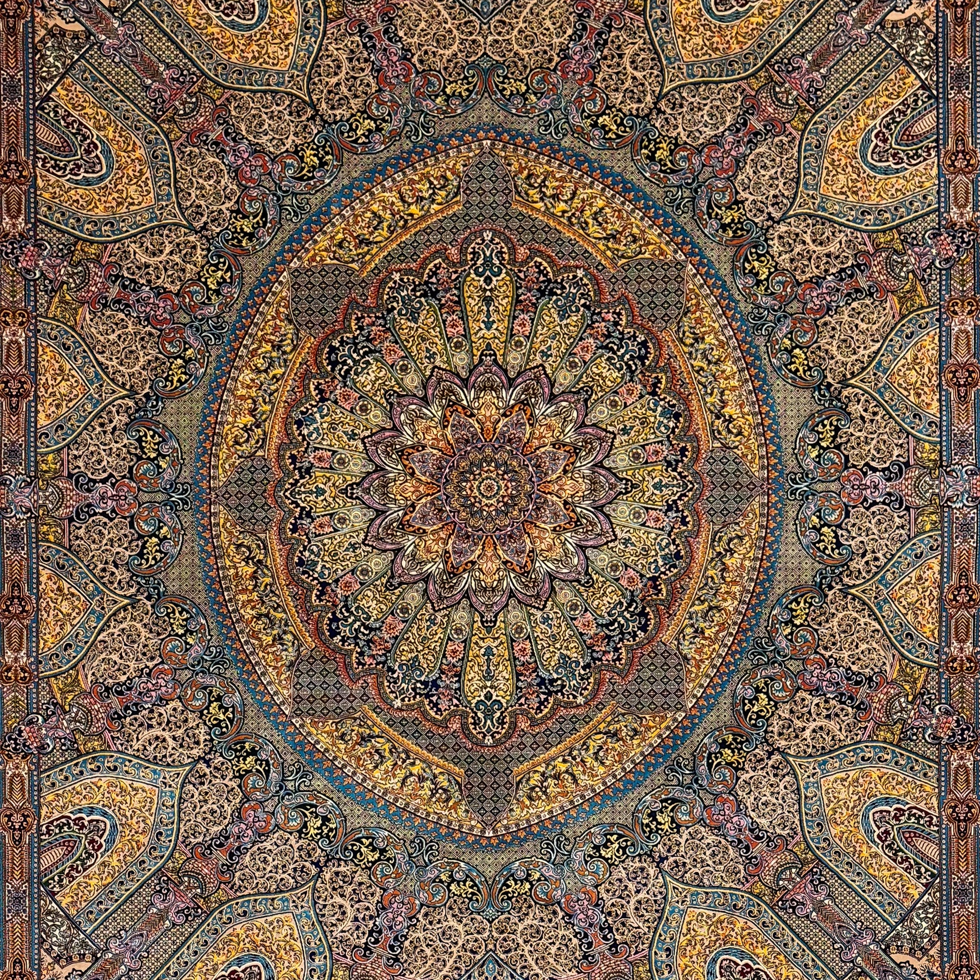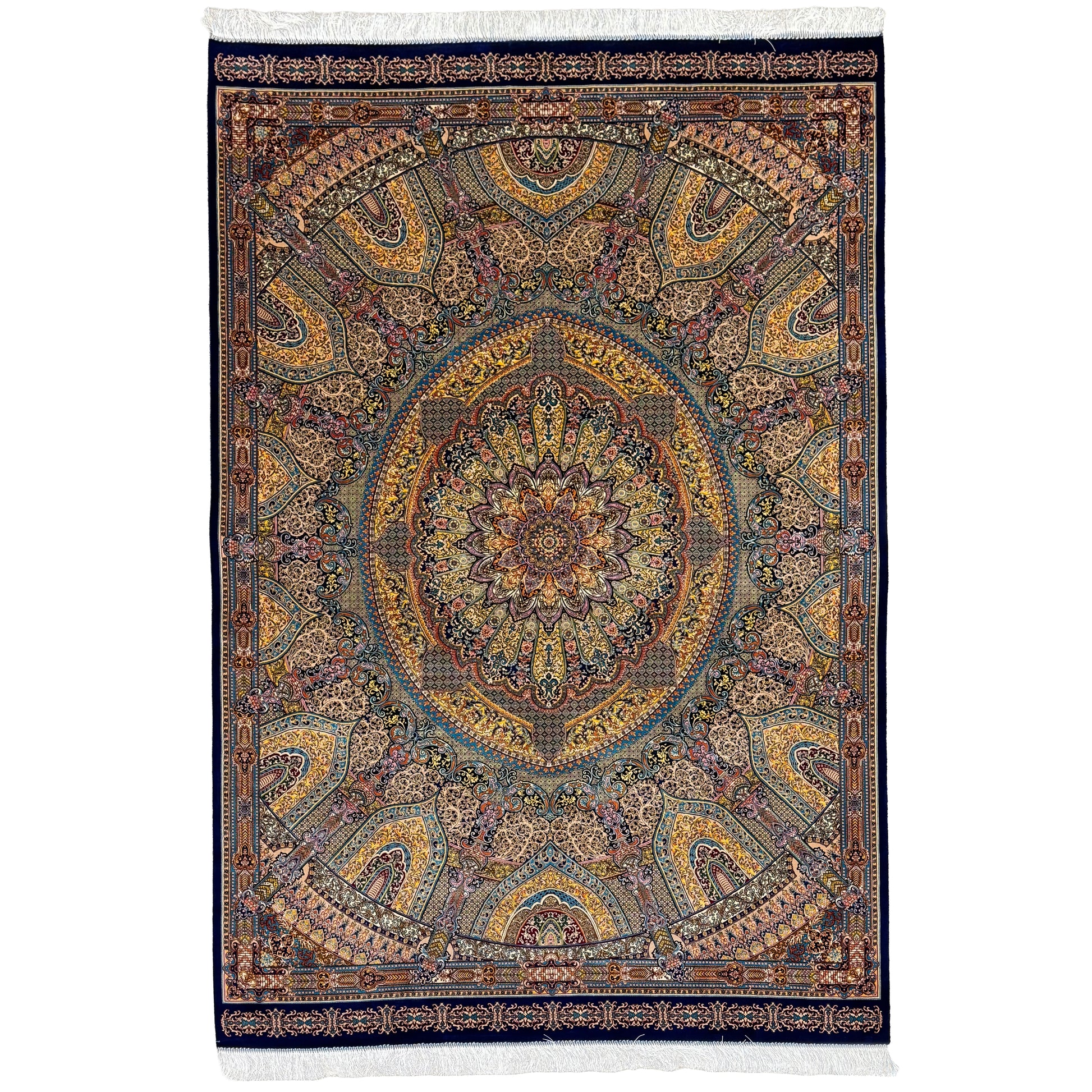 This silk rug features a massive, circular central medallion that dominates the composition like a domed ceiling. The primary pewter grey and stone tones are warmed by intricate gold and beige filigree. The design is highly architectural, with dense patterning that leaves little negative space. A multi-layered border echoes the grey and gold theme, providing a rigid frame to the ornate center, finished with white fringe edges.